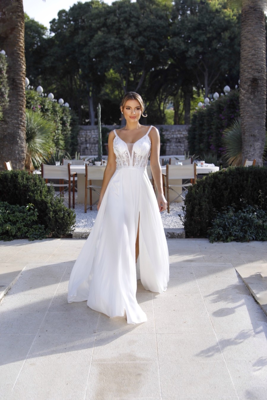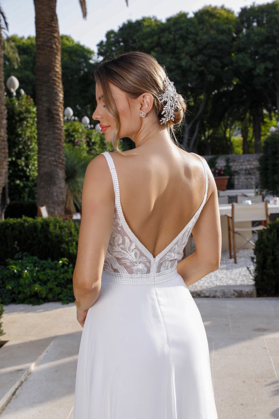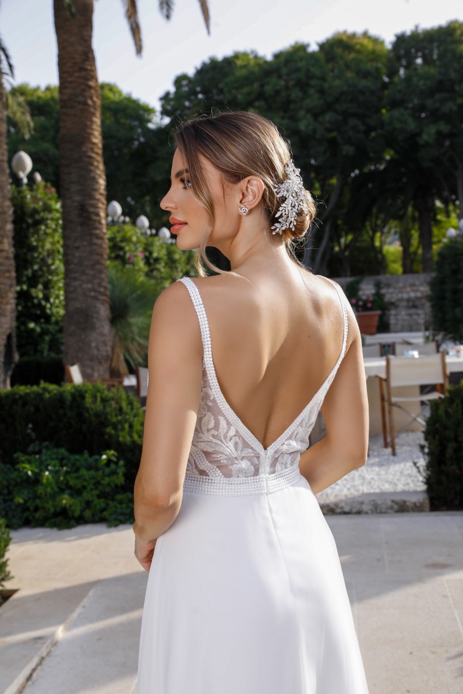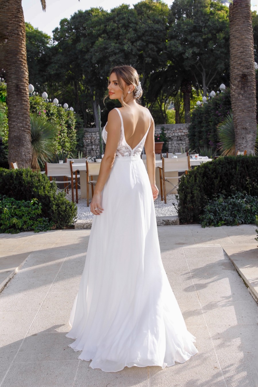Chiffon A-line skirt wedding dress with low, open V-back zip.