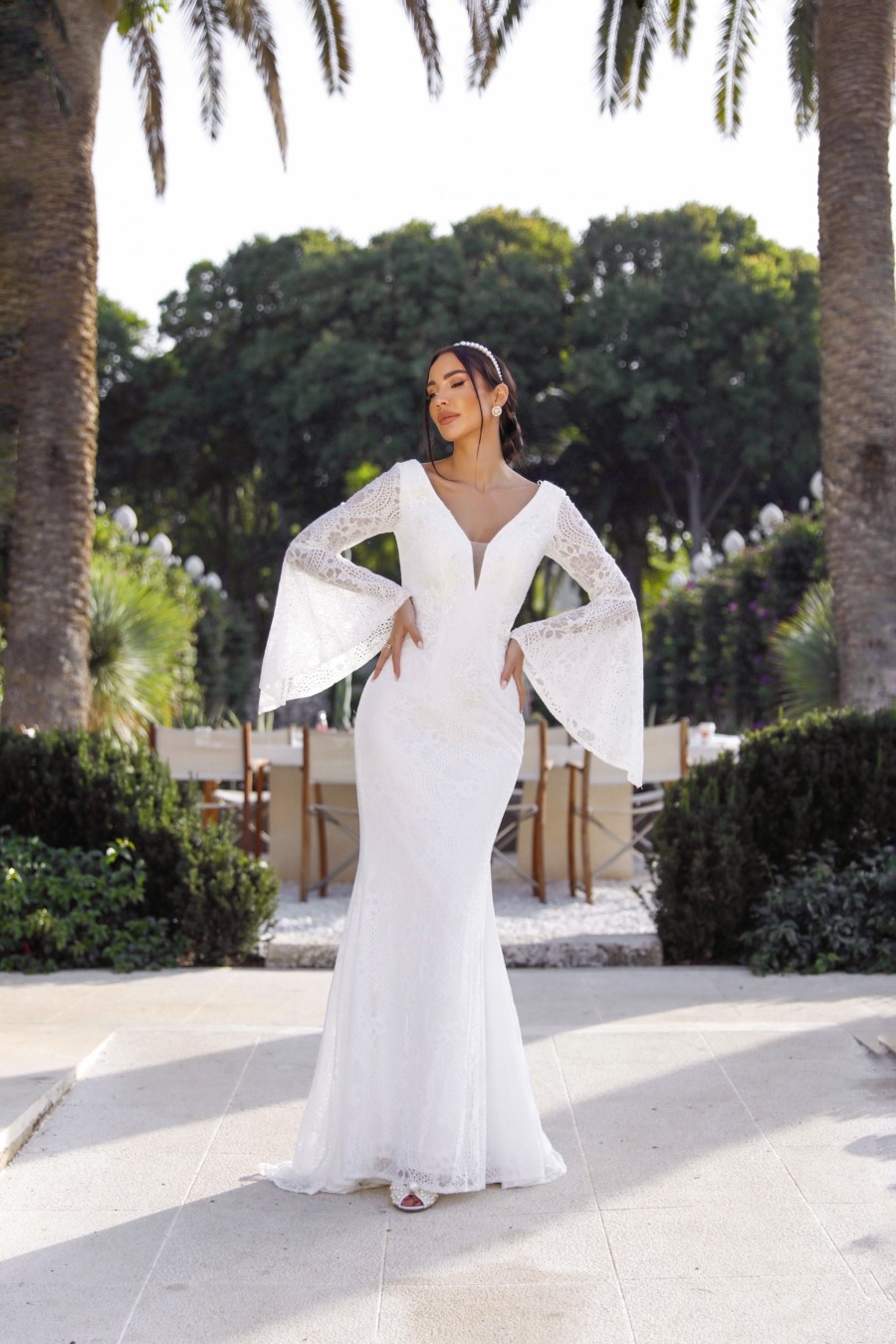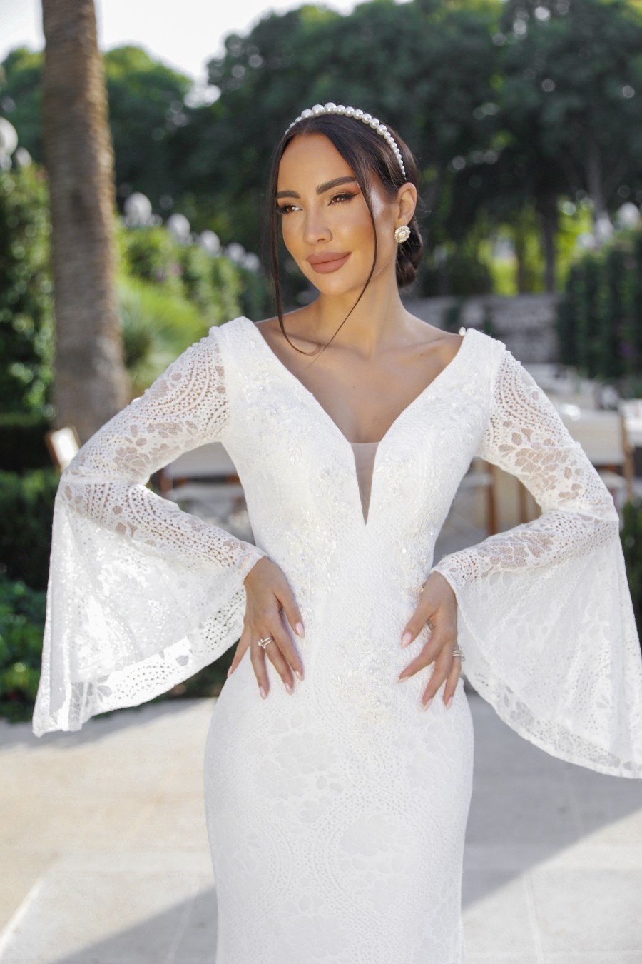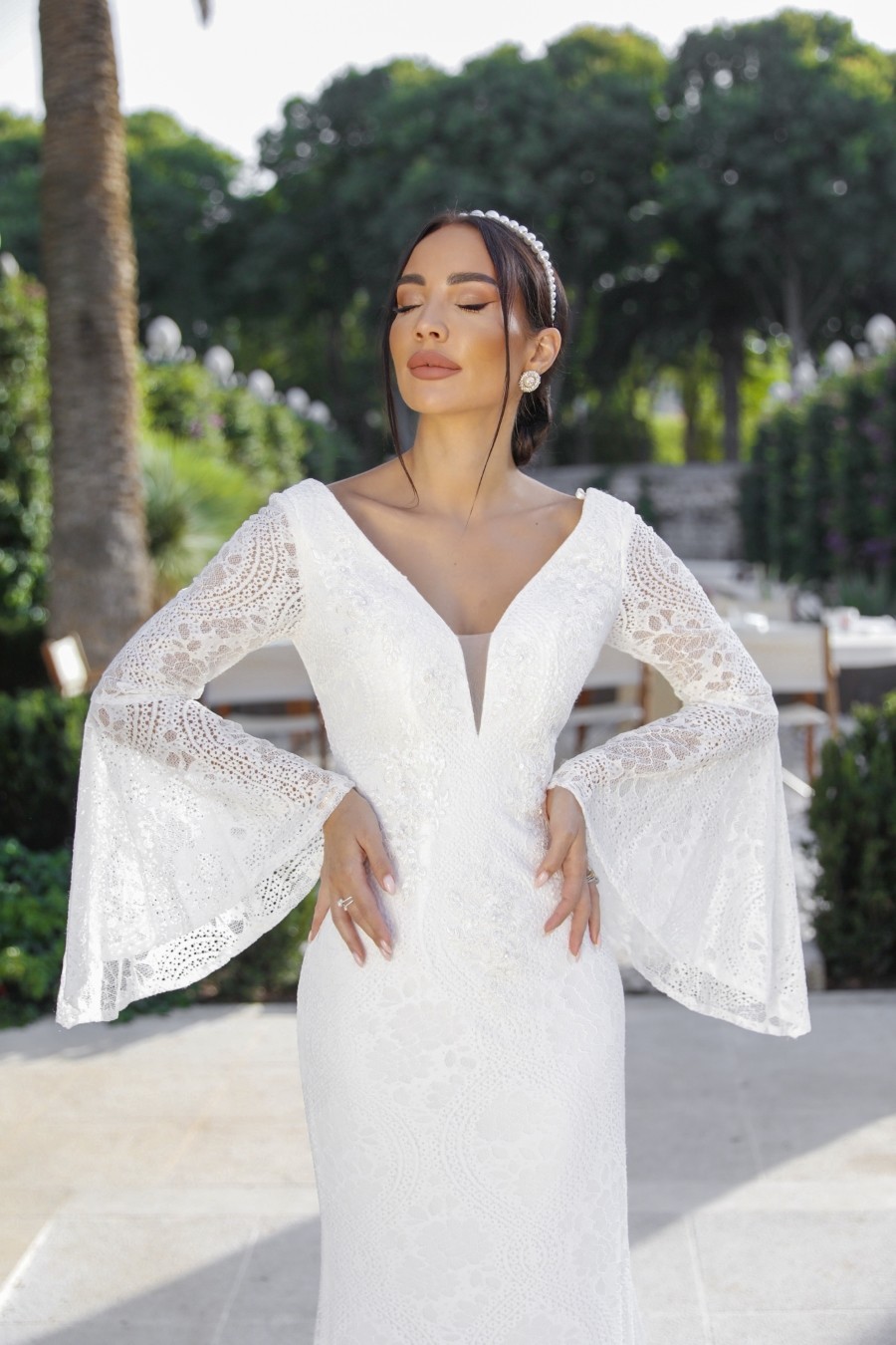 Mermaid style wedding dress from soft lace with unique sleeves.