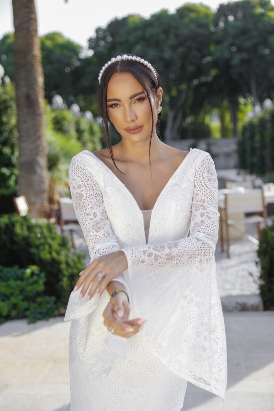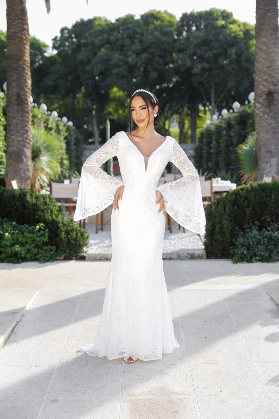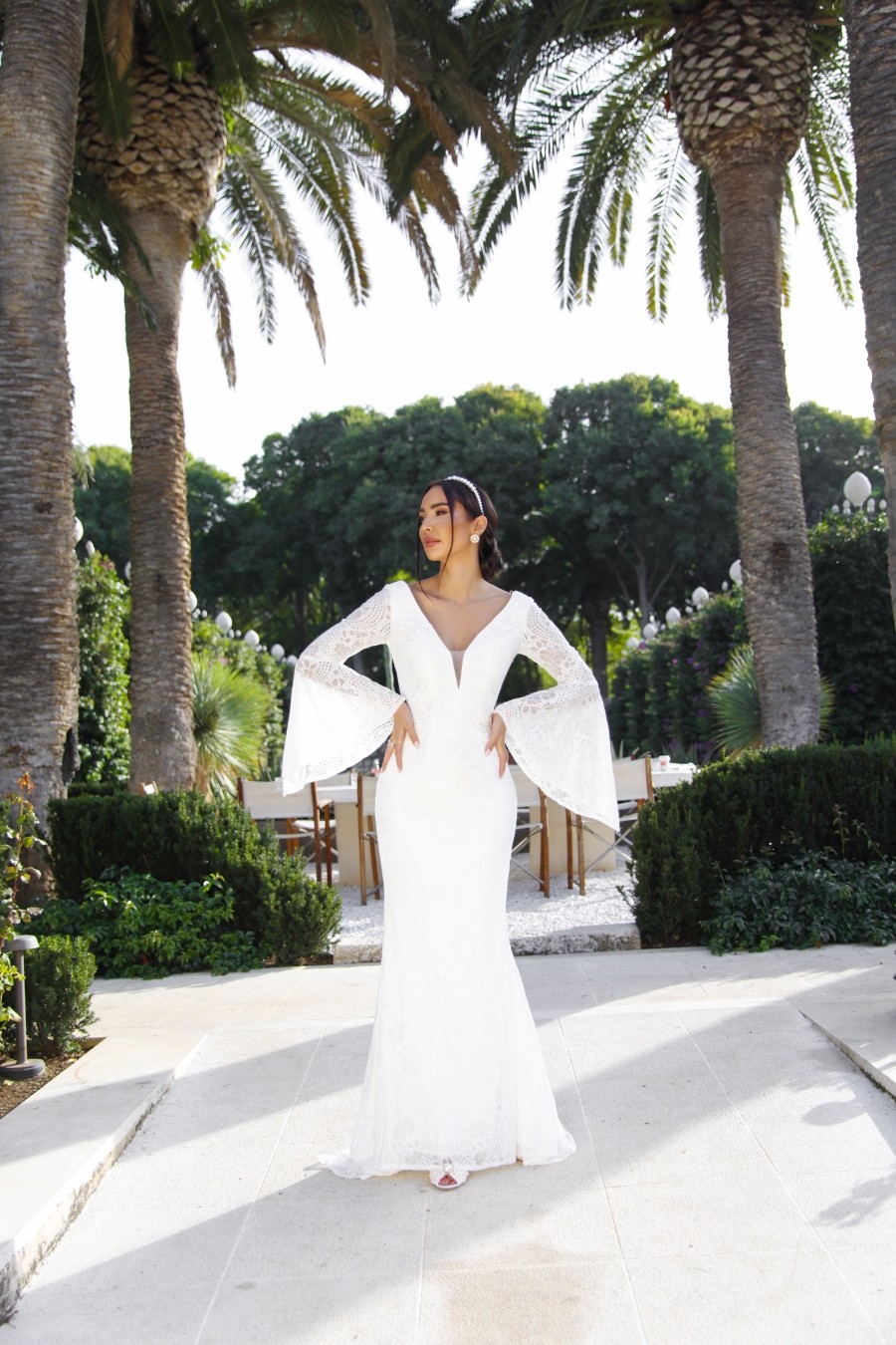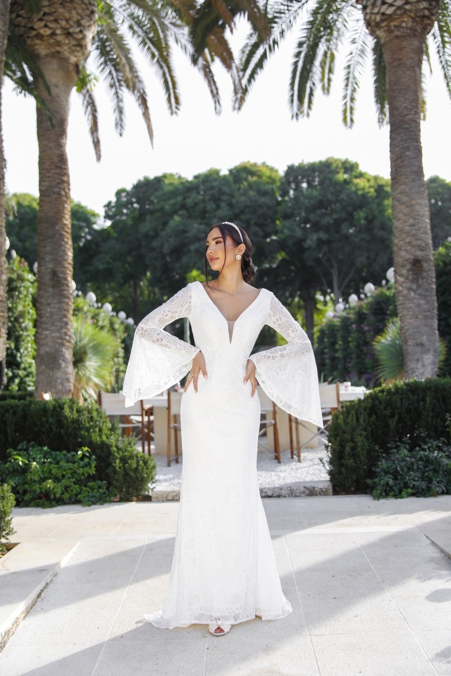 Mermaid style wedding dress from soft lace with unique sleeves.