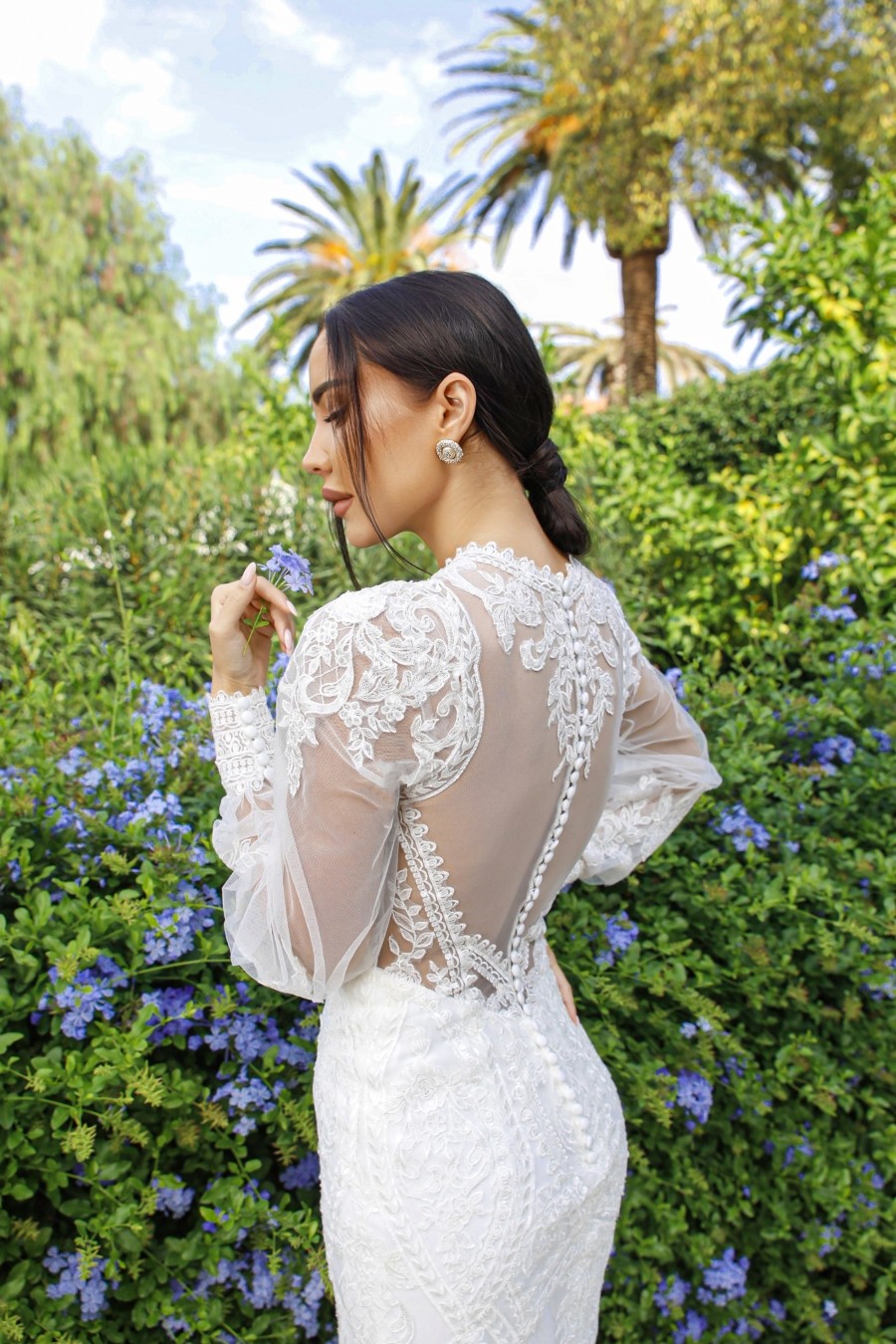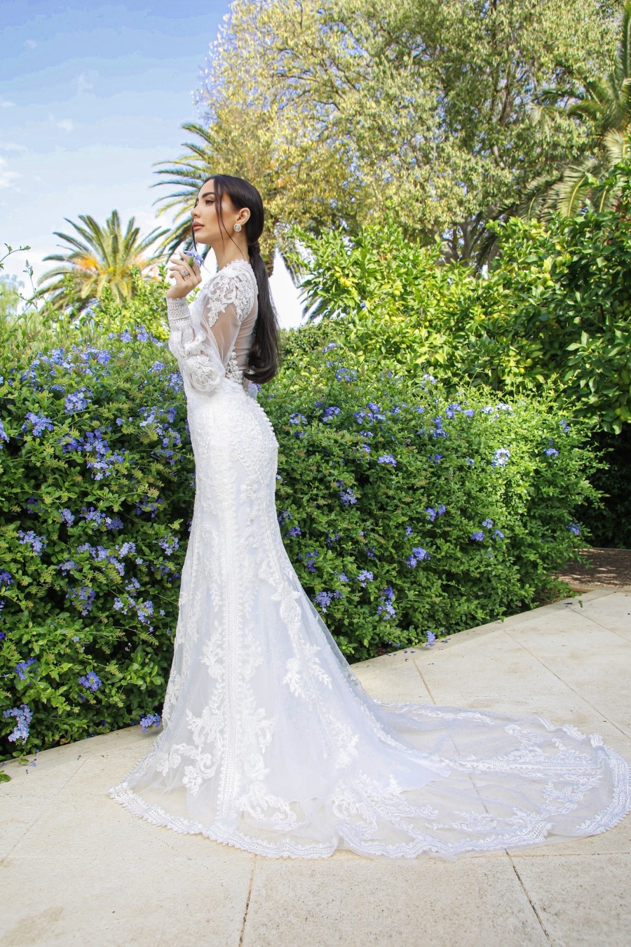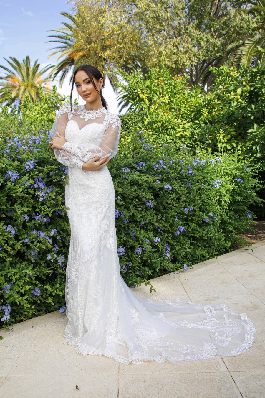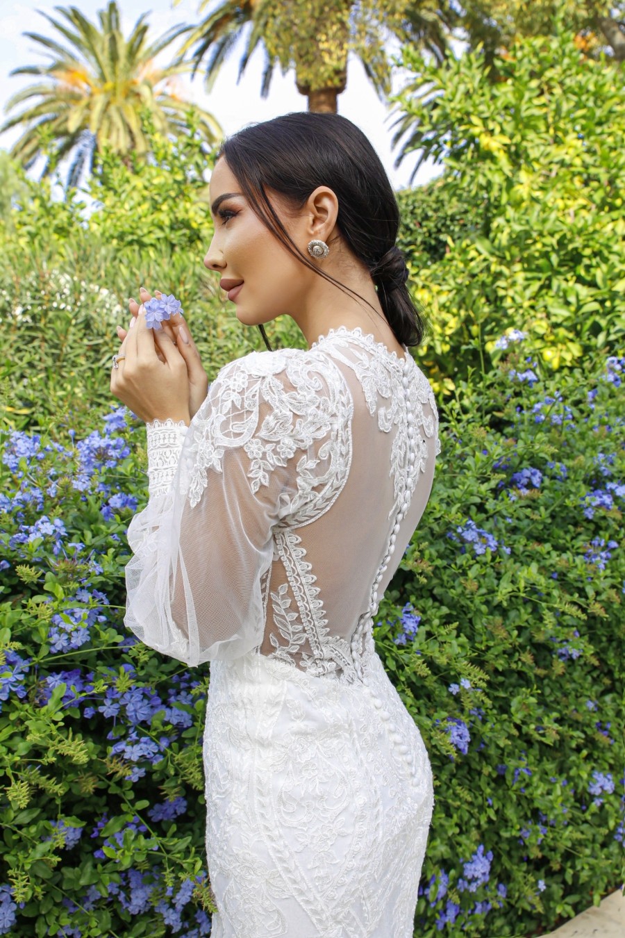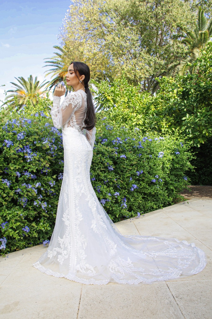 Mermaid style wedding dress with beautiful train and bishop sleeves.