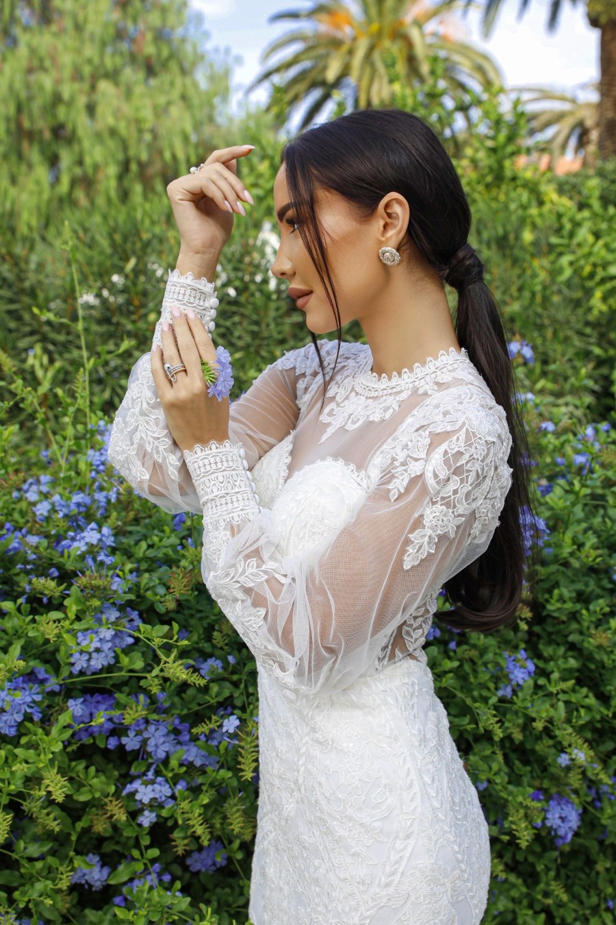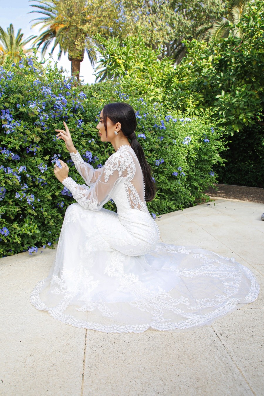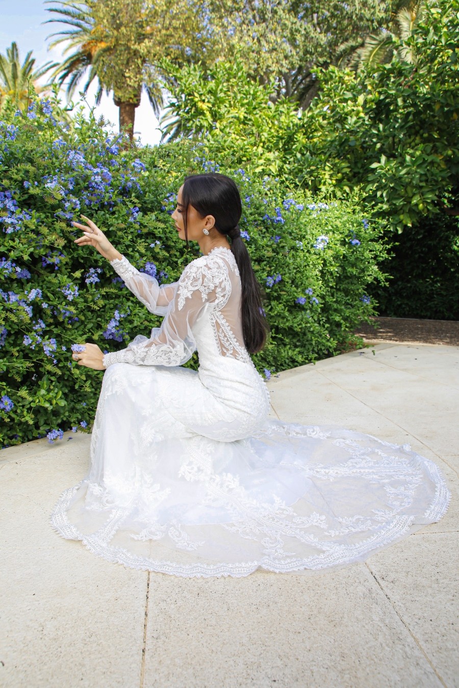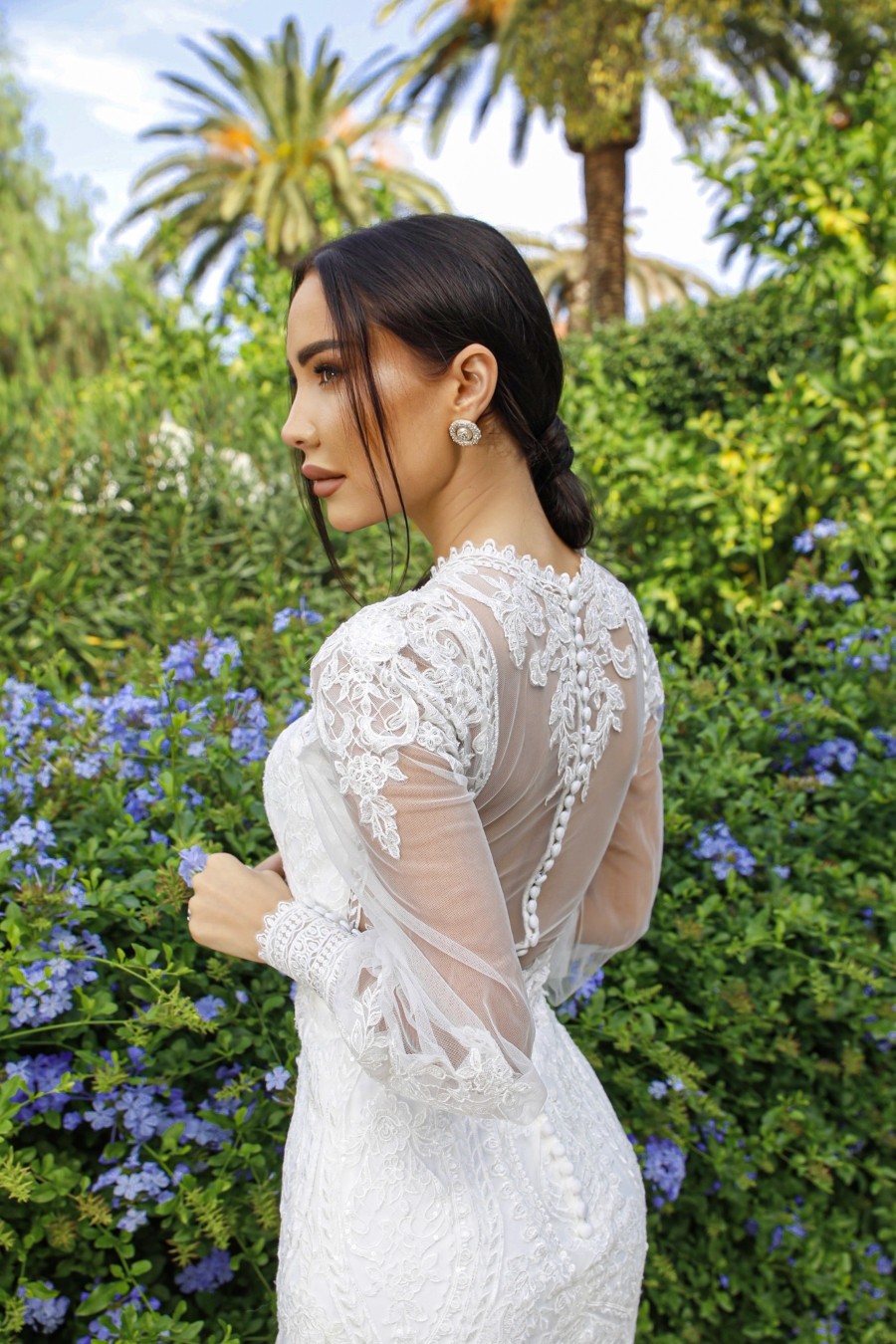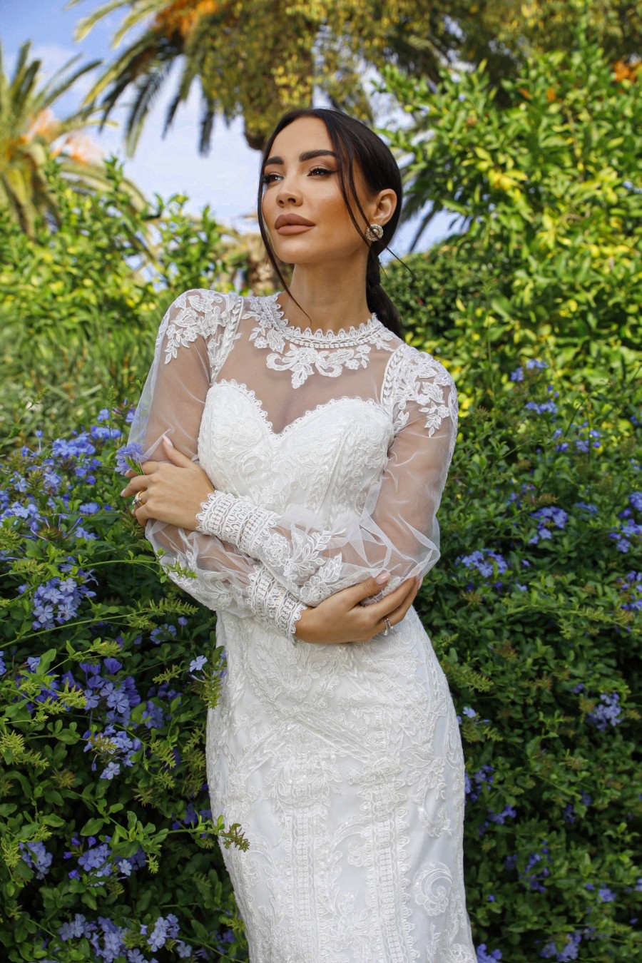 Mermaid style wedding dress with beautiful train and bishop sleeves.